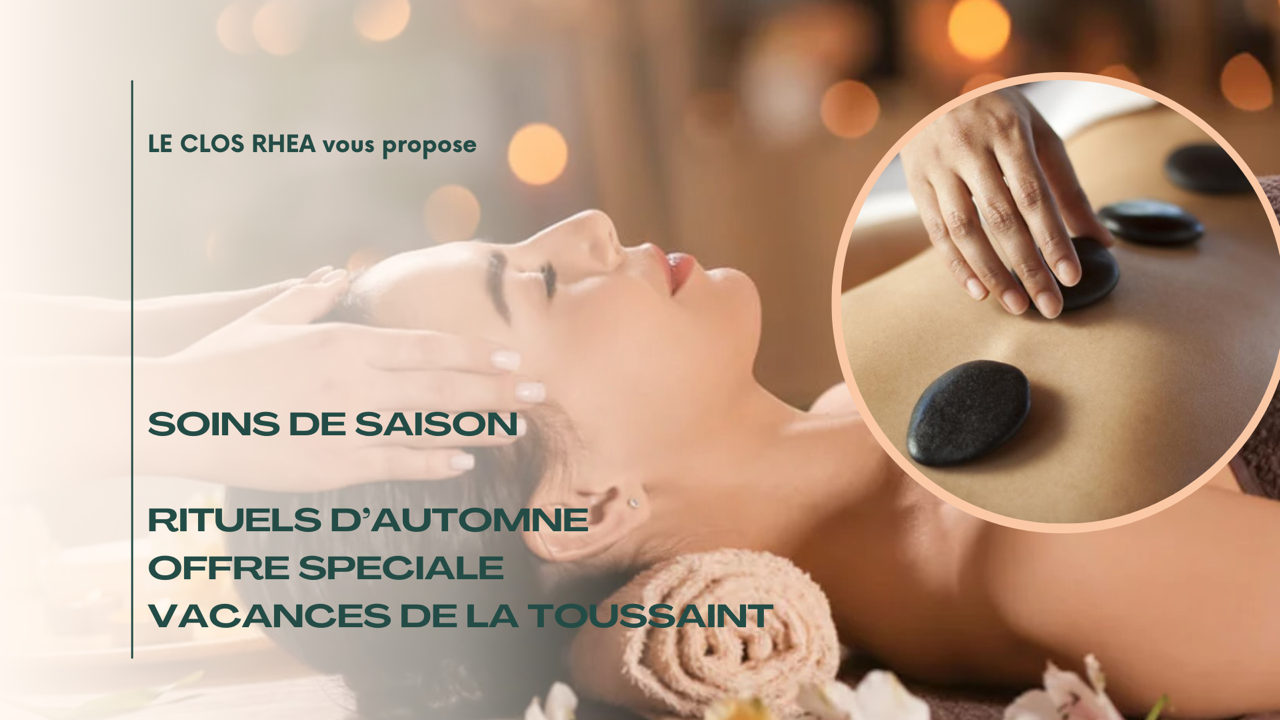 À l’occasion des vacances de la Toussaint, le Clos Rhéa vous propose deux soins de saison, spécialement pensés pour réchauffer le corps, apaiser le mental et recharger l’énergie.